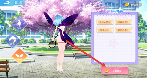 3、在翅膀列表中选择想要的翅膀如魅惑恶魔羽,点击下方消耗8888金币的按钮,完成翅膀购买。