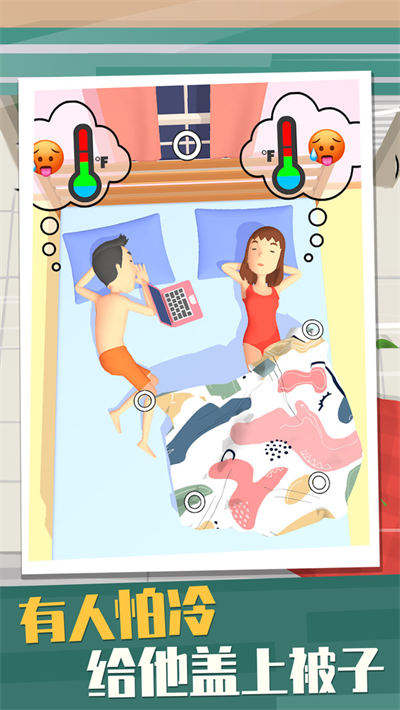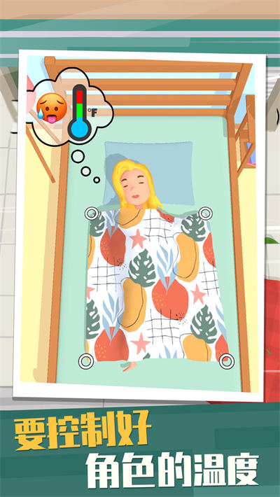 盖被子游戏是一款益智清新风格设计的休闲闯关类游戏,简洁的画面、清新的场景以及超多的关卡任由玩家进行体验,在游戏里玩家要根据温度来盖上合适的被子,来让场景之中的人顺利睡觉。