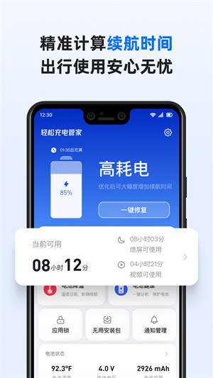 智慧电池管家是手机上的电池助手,实时管理你的手机电池健康,让手机电池健康使用,每天在线养成良好的玩手机习惯,精准计算续航时间,让你的出行不再担心手机电池问题,还能通过扫描耗电应用盐城续航,让手机超长待机。