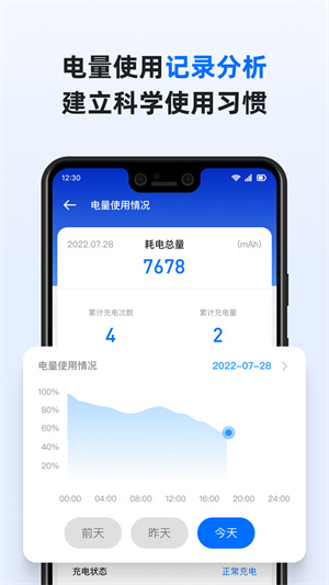 - 实时电池使用记录在线查看,看到当前电池的耗电详细,每天的使用情况都能查看,随时回顾。