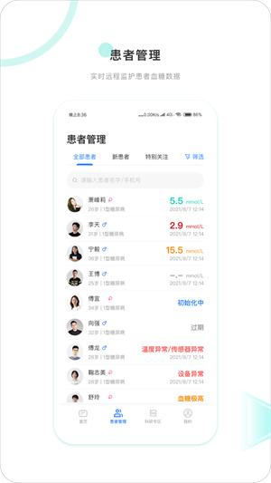 - 每一个患者在线便捷管理,实时远程监护患者的血糖数据,所有的患者全都看得见,自由设置并管理。