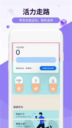 活力走路是一款运动记录软件,可以精准记录你的运动数据信息,每天在线实时记录信息,让大家可轻松查看自己的跑步、走路等运动数据,每天在线设置目标步数,向着你设置的目标步数达成完成,每日坚持打卡养成运动习惯。