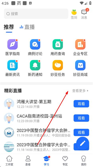1、在妙手医生医生版app的“学习”页面,点击精彩直播右侧的查看更多。