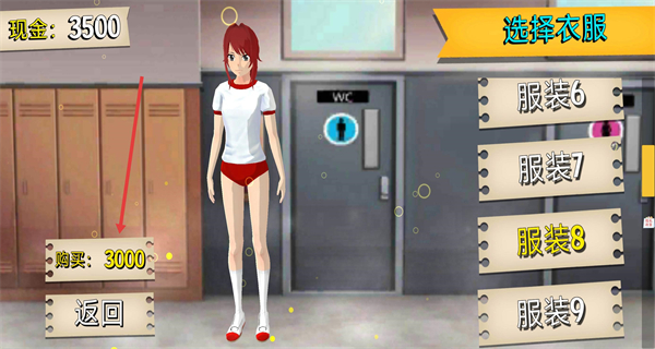 4、在服装选择界面,选择想要购买的服装如服装8,点击购买按钮,消耗3000现金完成服装购买。