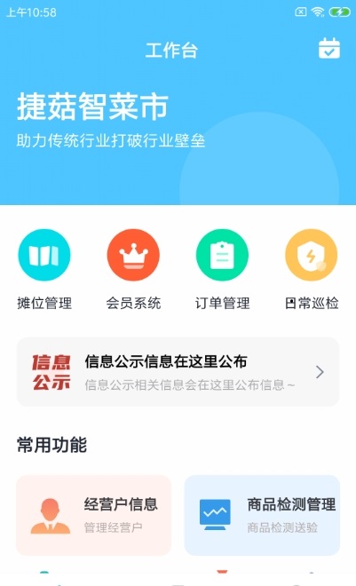 捷菇智菜市,一款专用于菜市场管理的app,软件可实现对所有菜市场摊位信息的录入功能,线上便捷回报最新的摊位巡检情况,相关问题可以及时获得回馈与解决,支持线上公告信息发布,使用更方便,有需要的用户可以下载使用!