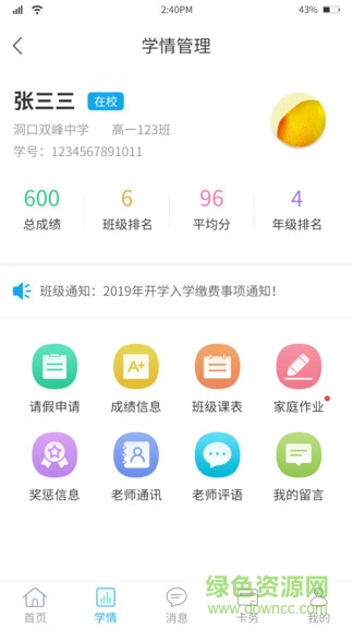 华卓教育家长端内设切换子女、快捷功能、新闻通知、学生学情、消息、卡务、个人中心七大功能板块,满足家长对学生在校考勤、学习情况、缴费消费情况全掌握。新闻通知与学生学情板块可加强家长同老师、学校的联系,了解学生所在班级、学校的最新动态。切换子女功能可实现一键切换不同子女在校学习情况,满足目前一户有多个学生的现实需要。