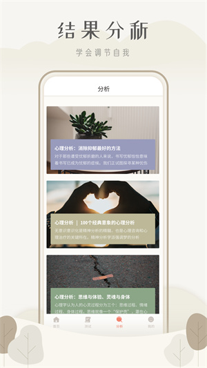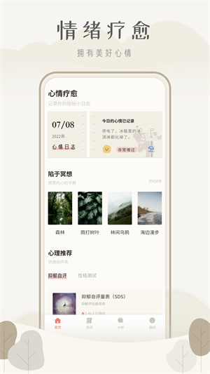 - 用户可以随时随地的在线进行自我检测,还可以让你能够更加了解该如何缓解个人情绪;