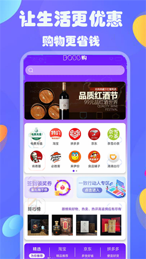 Boss购是一款生活购物软件,在这里省钱购物,包含了多个电商平台的购物优惠,让大家在线省钱购物,体验到超优惠的购物服务,随时随地在线下单购物,让生活更优惠,每一次的购物都能更省钱,每个用户都能体验到优质的省钱购物服务。