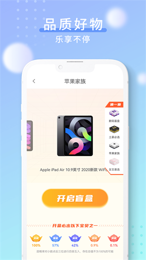 - 有几率开出平板、电脑、手机、香水、手表、手环、吹风机等商品,都是大牌好物,让大家趣味开盲盒;