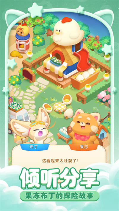 每一片云雾下都隐藏着惊喜,等着您去发现探索,会有更多惊喜,在这里,你可以通过二合一的简单操作,听着果冻和布丁的探险故事,解锁迷雾下的尘封的岛屿重现,和它们一起在岛上度过的快乐时光!