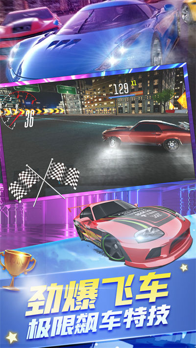 2、控制赛车从高速行驶,尽量加快漂移获得高额的分数,更好的表现
