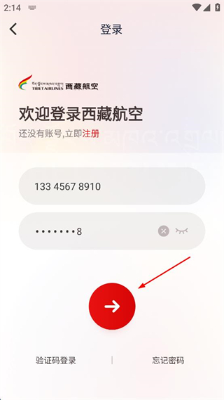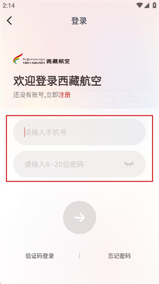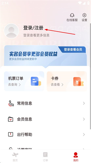 2、在个人中心页面找到登录/注册按钮,点击进入西藏航空的登录界面。