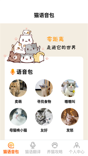 喵语翻译器是一款趣味猫咪翻译器,带来了超多的猫咪语音包给大家使用,卖萌、友好、发怒、母猫寻找小猫等喵叫声音提供给大家,点击免费使用,点击播放和自己的爱宠进行互动,同时还能在线开启录音,简单操作精准识别。