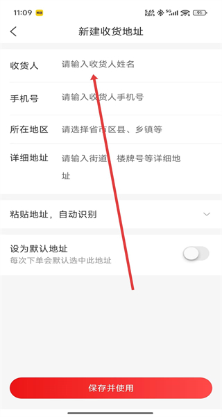 4、在新建收货地址页面依次输入对应信息后,点击“保存并使用”,完成收货地址的新建操作。