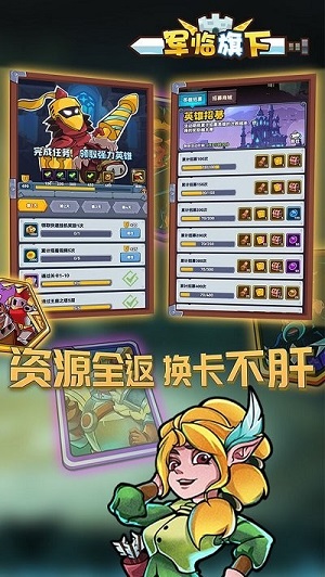 军临旗下玩家需要在游戏里面来不断的得到新的卡牌英雄来进行一个培养,增加我们的战斗力和阵容的强度,开始轻松的闯关和战斗。