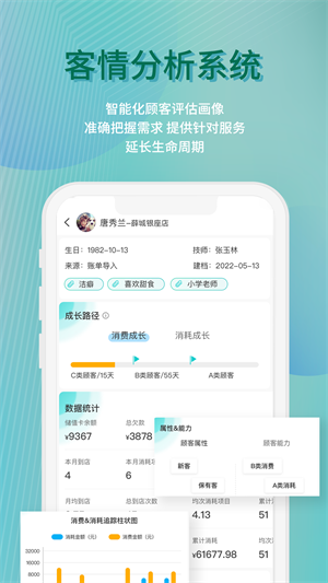 - 一系列的预约、销售、消耗、客情维护、客户分析,都能通过平台数据实现精准管控;