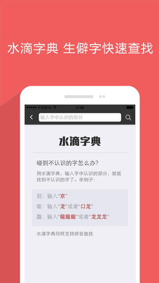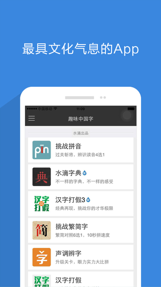 趣味中国字App是凤凰网水滴小组围绕中国字打造的最具趣味和实用意义的应用,用简单、轻松、有趣的方式教你认识中国字;挑战繁简字、声调辨字、挑战拼音,让你在各项挑战中了解包括读音、写法、释义、对照、扩展阅读等全方面的知识,成为不折不扣的文字达人。