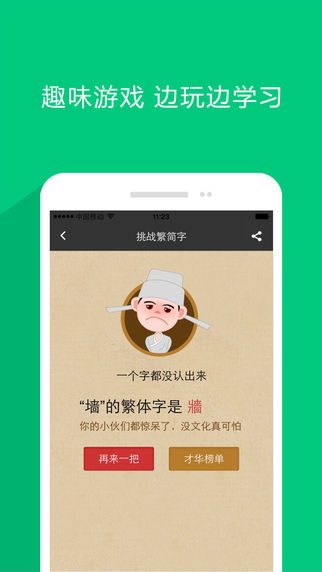认识中国字(趣味中国字)是一款教育学习类手机软件,通过简单有趣的方式和小游戏让你在玩中学,轻松掌握汉字,发现汉字的趣味,还有精彩的挑战等着你,喜爱的朋友赶快下载体验吧!