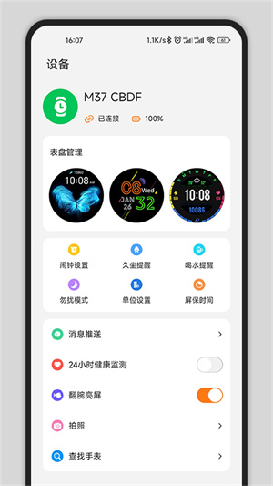 - 多样的功能更好的使用,带来大家可能需要的勿扰模式、屏保时间设置、表盘管理、二十四小时健康监测等。