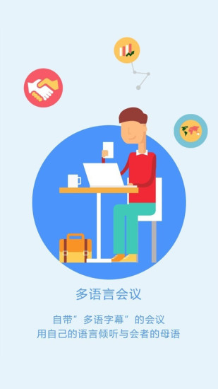 多语言会议:提供线上的中英间的同传服务,提供自助式的会议同传译功能,具备会议邀请,会议记录等功能。