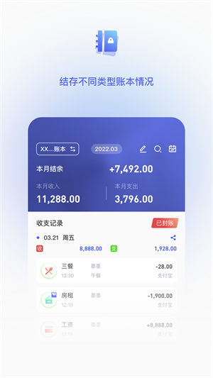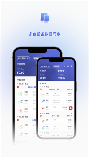- 多设备同步记录你的账单,可随时切换设备找回你的账单记录,云端存储不用担心账单会丢失;
