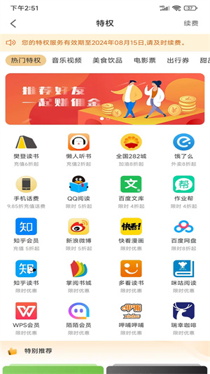 - 详细的分类快速查找,让大家找到众多音乐视频、美食饮品、电影票、出行券等多样的优惠福利领取;