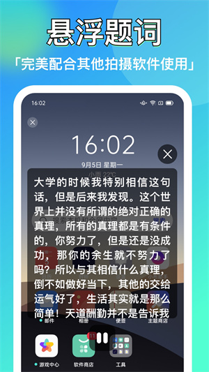 - 悬浮窗题词可以用于多个场景,拍视频、直播等等,可以搭配其他拍摄软件使用,还能进行滚动设置;