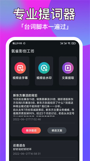 氢雀影创是手机上的悬浮窗提词器工具,为大家带来悬浮窗显示服务,每个小伙伴可以在线选择使用,简单操作开启悬浮窗显示,实时滚动显示内容,专业的悬浮窗提词器免费使用,还有文案提取服务可以使用,轻松提取视频中的文案。