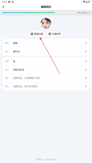 4、在编辑资料的界面内,点击更好头像的按钮即可。