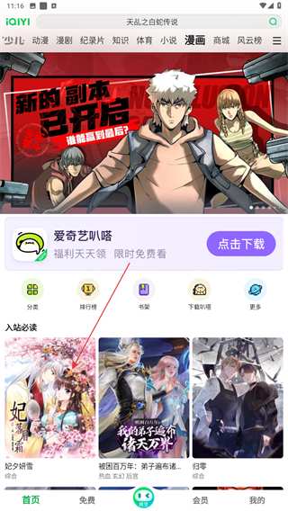 2、在右侧展示出的菜单栏中,选择并点击漫画按钮。