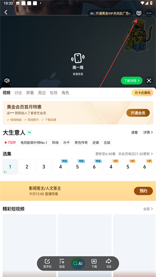 3、进入播放的页面内,点击画面右上方TV的按钮。