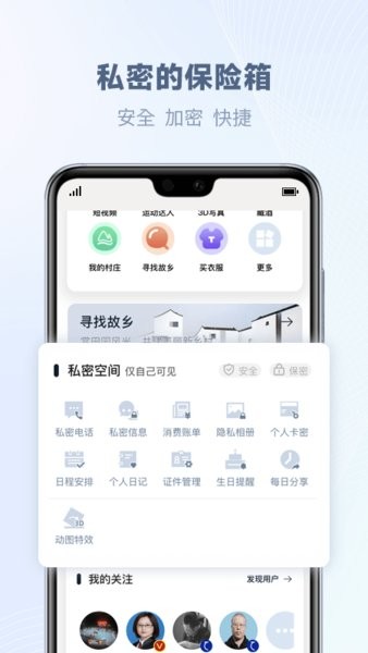 您可以方便使用平台为您提供的安全数据记录和管理工具,包括:私密通话、私密信息、消费账单、隐私相册、个人日记、证件管理、日程安排等。另外,您可以关注感兴趣的其他用户,浏览其近期动态,并可与其互动,点赞评论聊天等。您可以随时使用创作类的功能,记录下自己的所闻所思所想。您还可以方便地购买、分享平台提供的优质商品,满足您的日常生活需要。