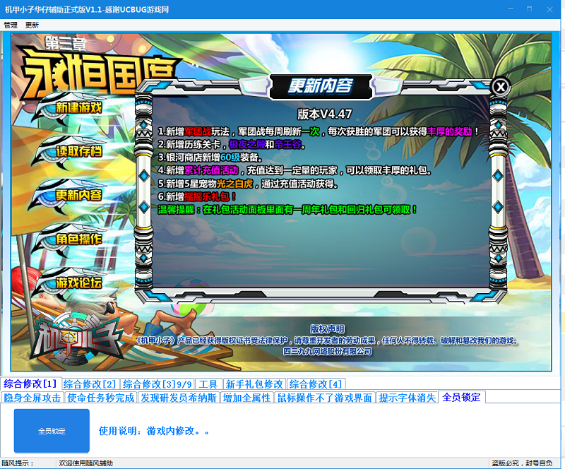 机甲小子华仔辅助(机甲小子修改器)是一款绿色免费的由玩家华仔为冒险游戏4399《机甲小子》永恒国度制作的辅助修改器。软件功能强大,为玩家提供了超人加速、无限幻影、技能无冷却等强大功能。能够帮助玩家快速成长,节省大量的时间与精力。