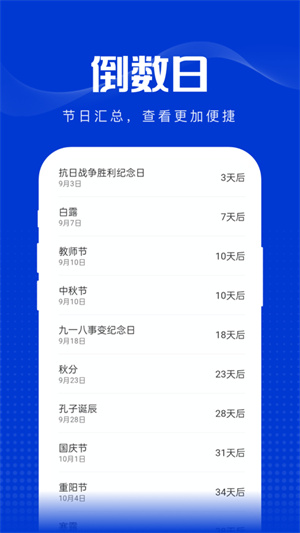 - 带来大家感兴趣的倒数日提醒,在线设置时间开启倒数日提醒,在指定时间提醒你,还有节日汇总提醒;