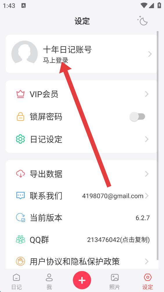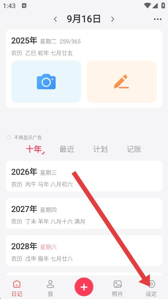 1、打开十年日记APP,点击主界面下方的设定选项。