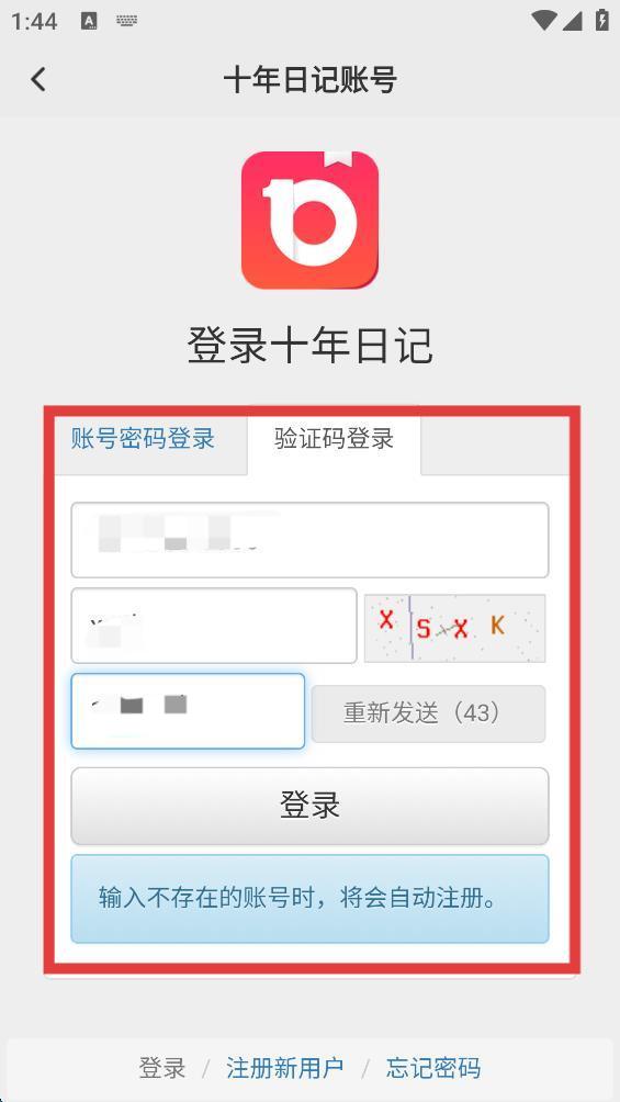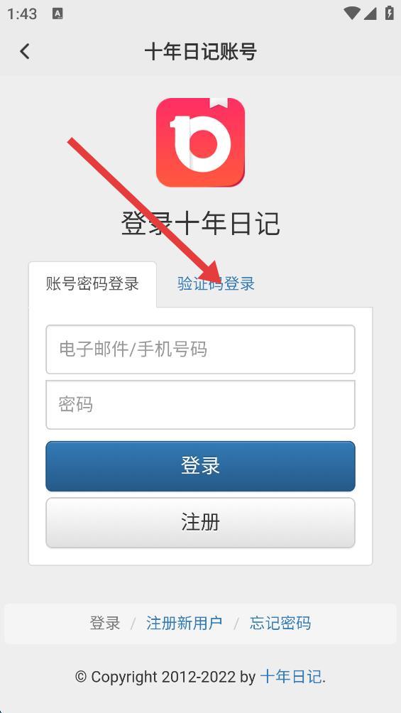 3、在十年日记账号登录页面,选择验证码登录方式。