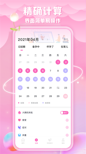 - 支持多种记录,经期、备孕、怀孕、育儿都能在线计算,简洁的界面易操作,适用于每个小伙伴在线使用。