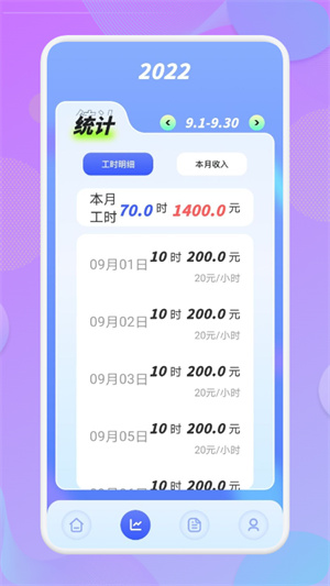 - 用日历的方式看到每个月的工作日期、时长等,可直接在日历上添加当天工作时长,还有工时、收入统计;