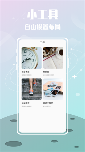 - 汇聚了超多丰富的小工具让大家自由设置布局,数字表盘、倒数日、运动步数、图片小组件任你使用。