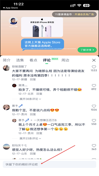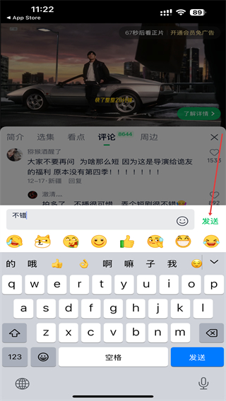 4、输入想要发表的评论内容后,点击发送按钮即可。