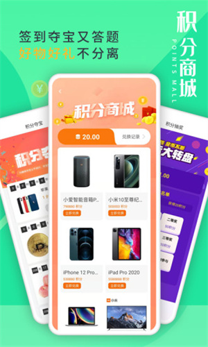- 签到夺宝领好礼,更多的游戏福利、生活福利可以领取,每天答题获得更多积分,用积分还能兑换新手机。
