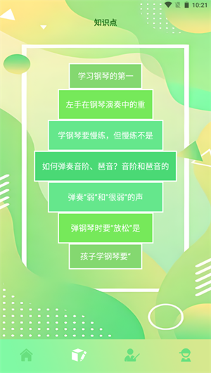 - 用户可以非常简单的直接在线学习很多的专业钢琴的知识,这款软件里面的各种知识内容都是非常的丰富;