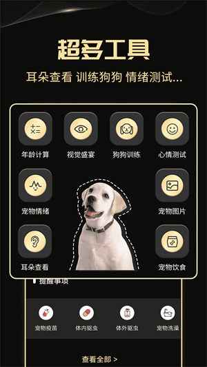 - 还有很多的计算宠物年龄、宠物情绪、萌宠图片、训练宠物、心情测试、视觉锻炼等功能,都是免费为用户提供的。