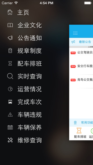 “青岛巴士通”集成了15个模块,内容包含“企业文化”、“公告通知”、“规章制度”等公示类;“配车排班”、“实时查询”、“运营情况”、“完成车次”、“车辆违规”、“维修查询”、“车辆领料”、“燃料消耗”、“营收情况”、“里程情况”等信息查询类;“考勤信息”、“个人薪资”、“个人就餐”、“乘车记录”等个人数据。