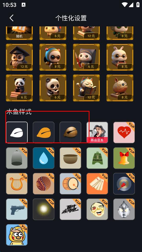 3、在个性化设置页面的木鱼样式区域,选择想要设置的木鱼样式,比如特定的木质木鱼样式。