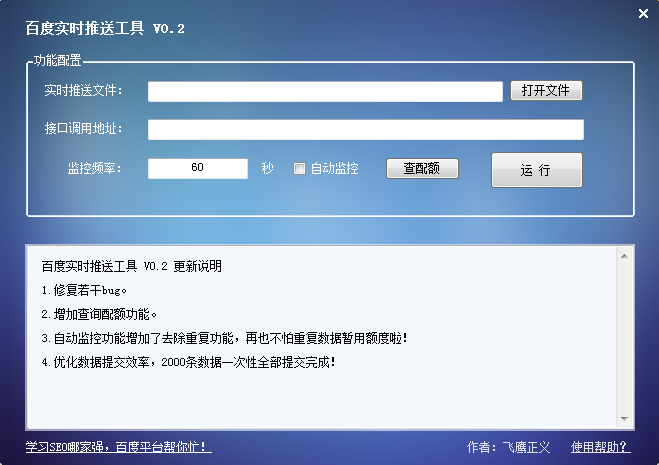 百度链接提交实时推送工具是一款可以将网站中最新更新内容的URL推送到百度,从而让百度更快的抓取网站内容,用户通过此软件可以自定义设置推送监控时间,程序在检测到推送文件中有变动,将会自动把连接推送给百度,用户在使用自动推送功能时,一定要注意的是,再此更新制定的txt文件的时候,如果之前提交的数据务必要清楚,否侧新老数据提交会给占用用户每天提交配额数量。