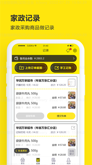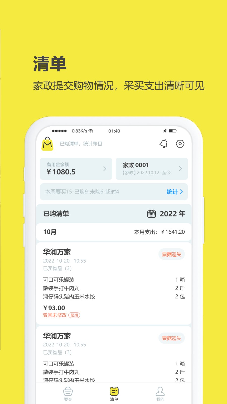 1、买菜清单是一款记录业主与家政之间钱款去向的工具;