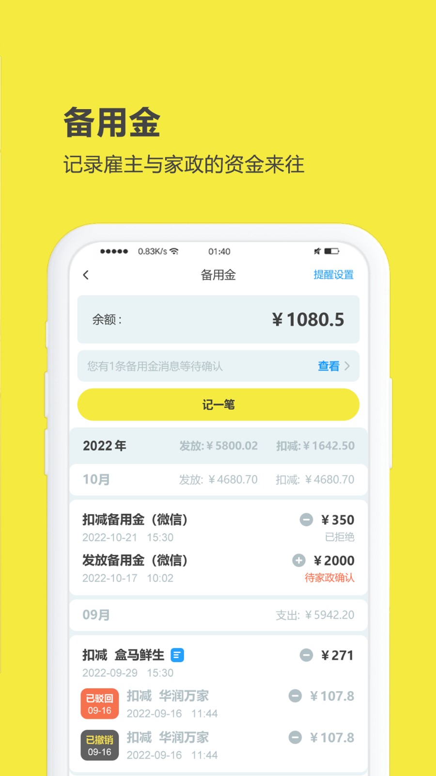- 手机上的钱款清单记录助手,专为业主和家政人员打造,让业主可以轻松查看每天消费支出记录;