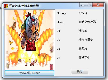 坏象坦博全版本4项修改器是针对同名游戏开发的辅助工具,使用很简单按小编介绍的快捷键操作即可修改游戏属性,包括无限血量、无限水量、无限PB、双倍花生的修改,欢迎下载使用。
