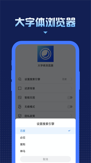 大字体浏览器是一键简洁的极速搜索浏览器,极速帮助大家搜索内容,用最快的速度搜索查找到对应的数据信息,每个小伙伴都能尽情查找,简洁的界面让搜索更加村崔,还有搜索历史记录、大字体、智能无图、无痕模式等服务提供。